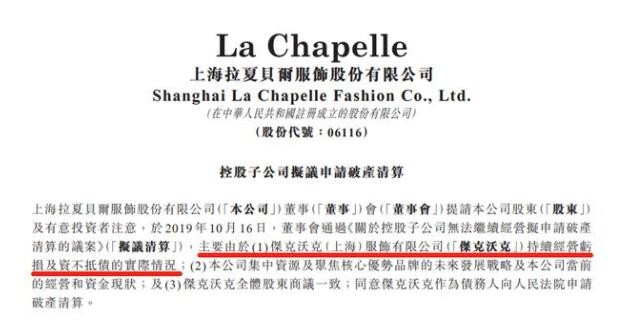 拉夏贝尔2019半年报显示,上半年公司大规模关闭了2470个线下零售网点,其旗下主营4大女装品牌营收也均同比下滑。拉夏贝尔公司归属净利润为-4.98亿元,同比下降311.2%。此外,因为经营持续亏损、无法继续经营,今年10月16日,拉夏贝尔公司发公告称,旗下子公司杰克沃克公司拟向法院申请破产清算。