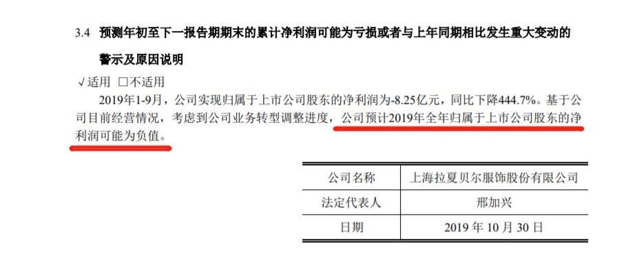 南都记者此前报道,2019年以来,拉夏贝尔业绩不佳。上半年,拉夏贝尔关闭了2470个线下零售网点,其旗下主营4大女装品牌营收也均同比下滑。同时,据拉夏贝尔2019三季报,公司前9个月净亏损8.25亿元。拉夏贝尔预计,2019年全年归属于上市公司股东的净利润可能为负值。