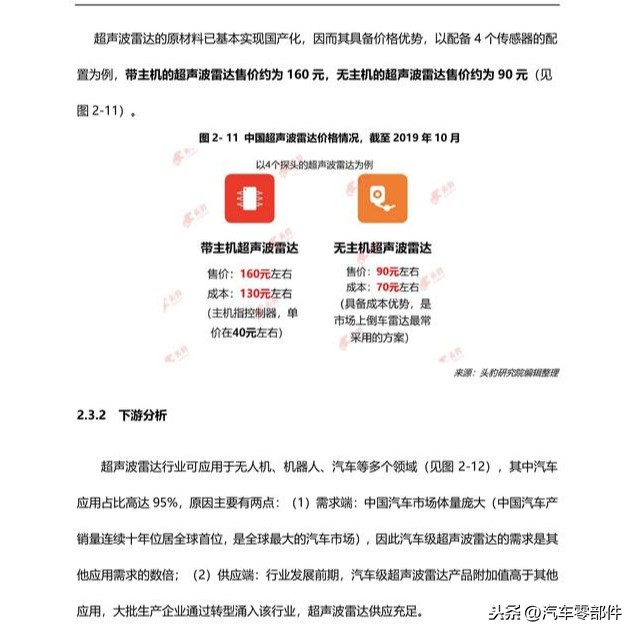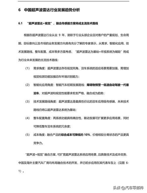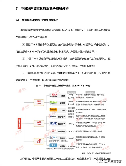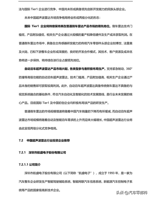 l 自动泊车超声波雷达将成为核心产品,行业将依托产品形成两级分化、格局普通倒车雷达的市场规模增速将随着中国汽车销量的下降而有所缓减,而自动泊车超声波雷达市场规模将随着自动及智能泊车需求的上升而迎来大幅增长,此外,自动泊车超声波雷达系统产品附加值高,将成为行业的核心产品,中国超声波雷达行业将依托两种产品呈现两级分化式竞争格局。
