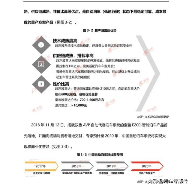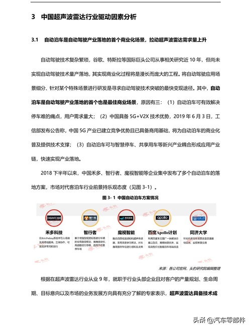自动泊车是自动驾驶产业落地的首个商业化场景,拉动超声波雷达需求量上升自动泊车是自动驾驶产业落地的首个也是最佳商业场景,超声波雷达具备技术及供应链成熟、性价比高等优点,应用超声波雷达是自动泊车状态下最稳定可靠、成本最优的量产方案。预计至 2020 年,中国自动泊车系统将实现大规模商业化,将推动超声波雷达需求上涨。