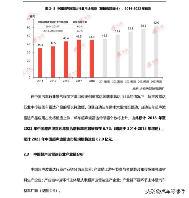 超声波雷达,是一种利用超声波测算距离的雷达传感器装置,多应用于倒车、泊车场景。受益于中国汽车销量不断提升以及超声波雷达装配比率的上升,中国超声波雷达行业市场规模持续增长,2014 年至 2018 年,中国超声波雷达行业市场规模(按销量统计)从 35.3 亿元人民币增长至 44.9 亿元人民币,年复合增长率为 6.2%。中国自动泊车需求持续上涨,未来“超声波雷达+视觉”的融合传感器方案将成主流技术路,预计至 2023 年,中国超声波雷达市场规模将达到 62.0 亿元。