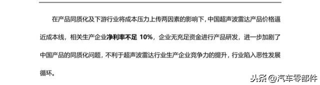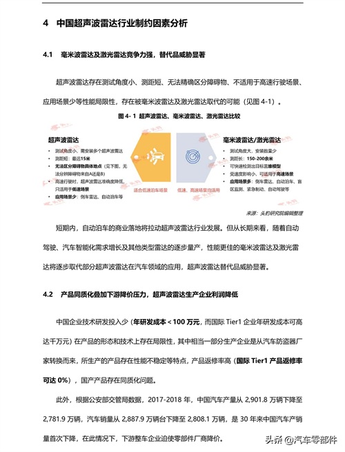 l 超声波雷达替代品威胁显著,行业利润降低超声波雷存在测试角度小、测距短、无法精确区分障碍物、应用场景少等局限性,存在被毫米波雷达及激光雷达取代的可能。此外,在产品同质化及下游行业将成本压力上传两因素的影响下,中国超声波雷达净利率下降至不足 10%。但超声波雷达在低速驾驶场景的应用无法被取代,其市场规模仍将维系。
