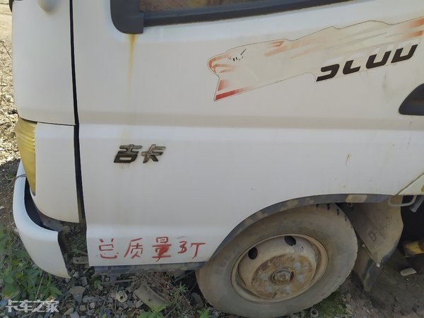 驾驶室的车门上有一条由前部向后贯穿的线条,并且粘贴了吉卡的标识,提高了车辆的品牌辨识度,但由于缺乏保养已黯淡无光。