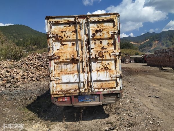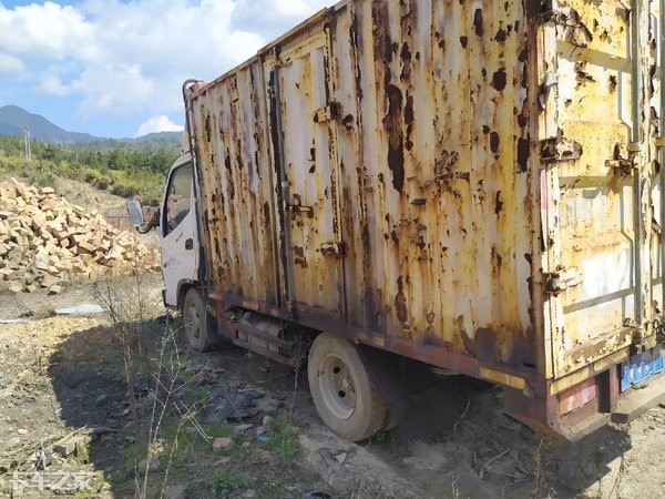 货箱的两侧由于风吹日晒老化严重,车漆出现大面积的脱落情况,漏出铁皮的位置也锈迹斑斑,不知是什么原因它被遗弃于此,不然依旧是一名奔驰在路上的勇士;底盘的两侧布局较为规整,200L的油箱足矣满足轻卡短途行驶里程。