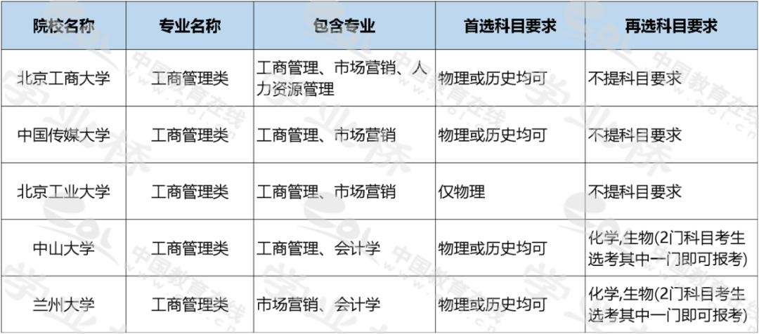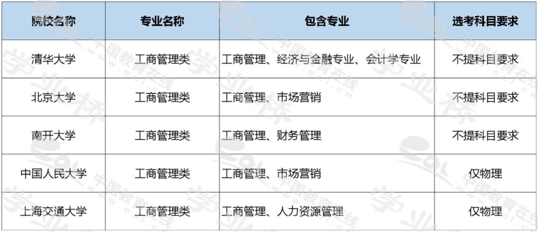 2020年北京等地采用3+3选科模式,在该模式下,大部分院校的工商管理类专业不提科目要求,如清华大学、北京大学、南开大学等。少数院校要求必须选考物理,如上海交通大学、中国人民大学等。