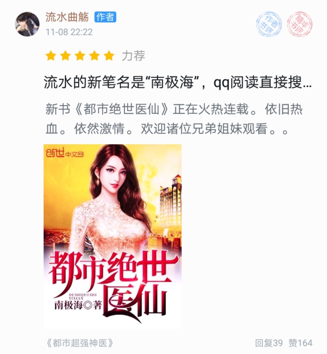 但作品总是太监烂尾,经常被读者骂。2017年开了马甲“南极海”,写了《都市超级医仙》。