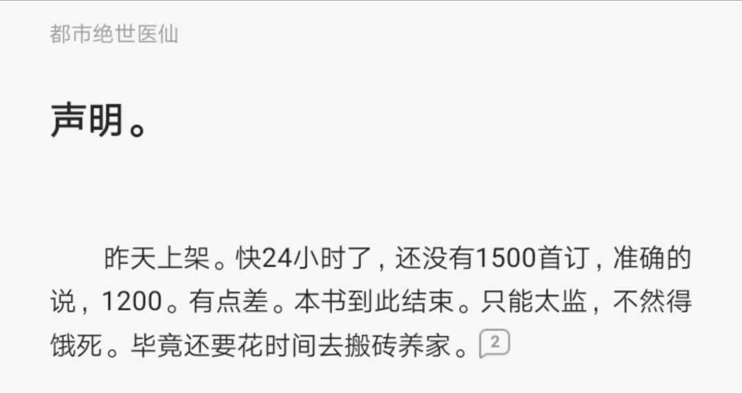 到现在一个半月,更新有三十万字出头,前两天刚上架,更新了两章VIP章节,首订1200,然后又太监了!