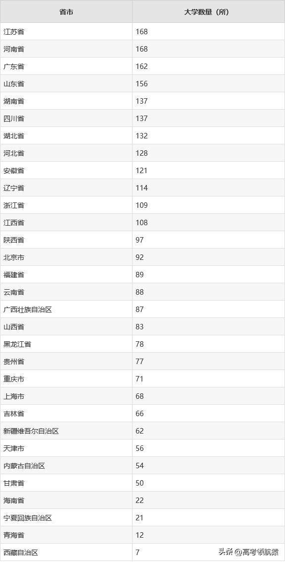 可以发现我国大学数量最多的是江苏省和河南省,一共有168所普通高等学校,大学数量排名前五的还有广东省(162所)、山东省(156所)、湖南省(137所)、四川省(137所)。大学数量最少的地区是西藏、青海、宁夏、甘肃等西北地区,这些地区由于地理位置原因,经济发展缓慢,教育也落后于经济大省。
