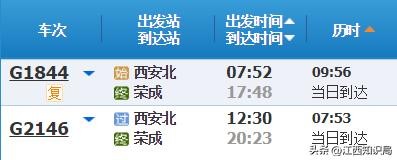 目前,西安至荣成每天有2个车次的高铁,即G1844次和G2146次列车。