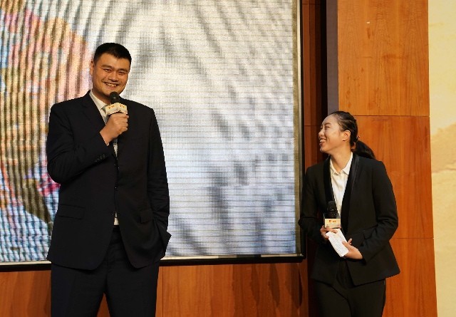 2017年11月WCBA新闻发布会上,邵婷与姚明互动。新华社记者孟永民摄