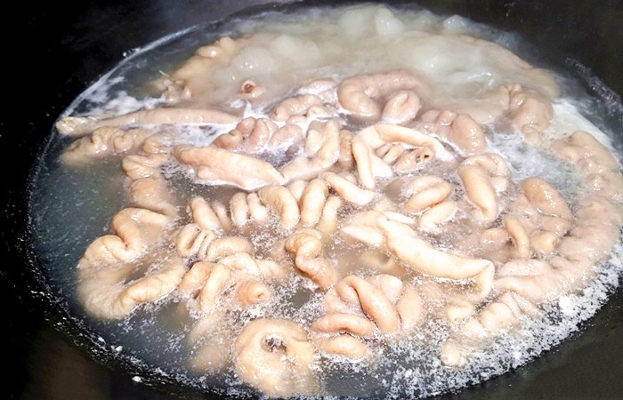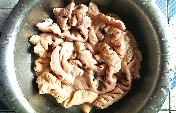 上面只是把肥肠洗干净,接着要去除腥臭味。把肥肠翻过来,内壁有很多白色的油脂,这些油脂就是肥肠腥臭味的主要来源。可以把大块的和厚实的油脂撕下来,这样腥臭味就很淡了。但是要稍微留一点,否则吃着就不香了。
