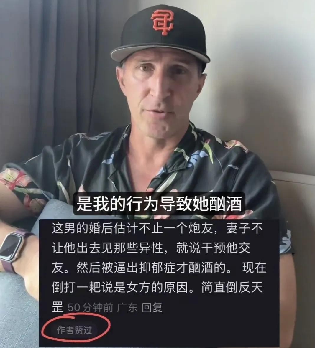 随后,这个外国男人又晒出那个中国妻子点赞的另一个网友说她酗酒是因为男方导致的评论。