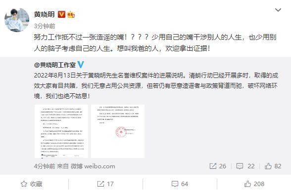 黄晓明本人也转发了工作室的声明:“努力工作抵不过一张造谣的嘴!???少用自己的嘴干涉别人的人生,也少用别人的脑子考虑自己的人生。想叫我爸的人,欢迎拿出证据!”