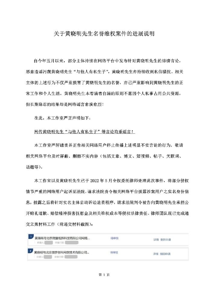 工作室上传的声明中,透露今年5月以来,各大平台诽谤和恶意捏造黄晓明与他人有私生子,工作室要求相关平台删帖,同时表示已在5月份委托律师起诉到法院,要求被告向黄晓明赔礼道歉并赔偿精神损害抚慰金,而律师团队已完成递交立案材料。