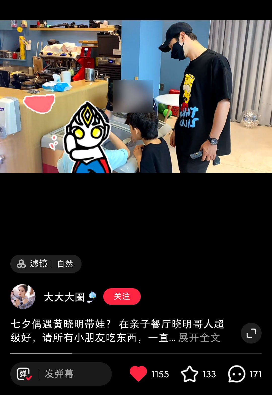 8月12日,有网友表示在亲子餐厅偶遇黄晓明与小海绵,当天黄晓明陪儿子玩耍,穿着拖鞋非常接地气,主动跟小朋友表示想吃零食的话他请,态度随和语言友善,是一个非常贴心的奶爸,期间有小朋友抢走黄晓明手中的玩具枪,他也没有阻止,而是风轻云淡。