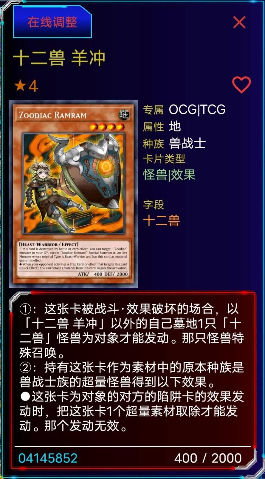 羊冲,R卡,经典忘记印一回合一次的假卡,只要被破坏就有效果,搭配狗环的复活与龙枪的破坏,可以达到超展开的效果,只要墓地有十二兽的怪兽,就可以一卡展开,不过在铁兽的卡组中,调度他很容易,只需要带一张即可。